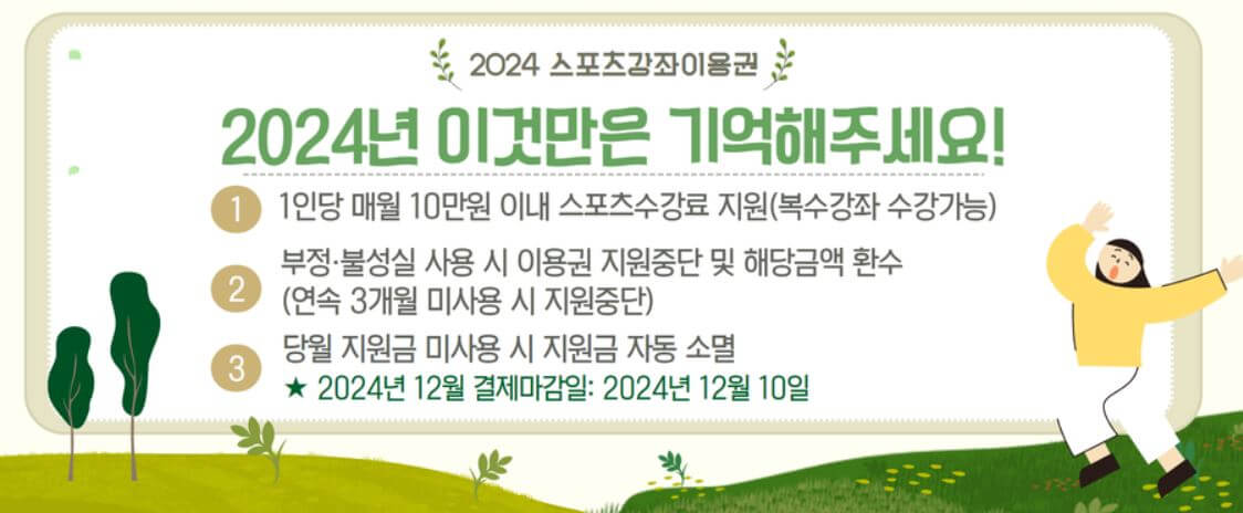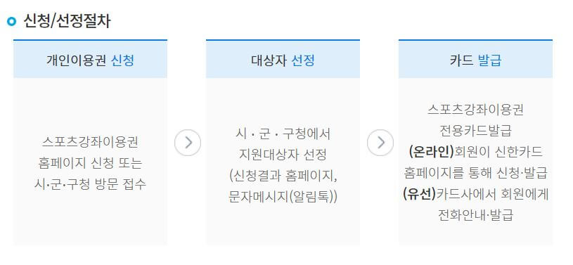 - 지원내용 : 1인당 매월 10만원 범위 내 스포츠강좌 수강료 지원, 1인당 지원기간: 연간 12개월 지원 가능